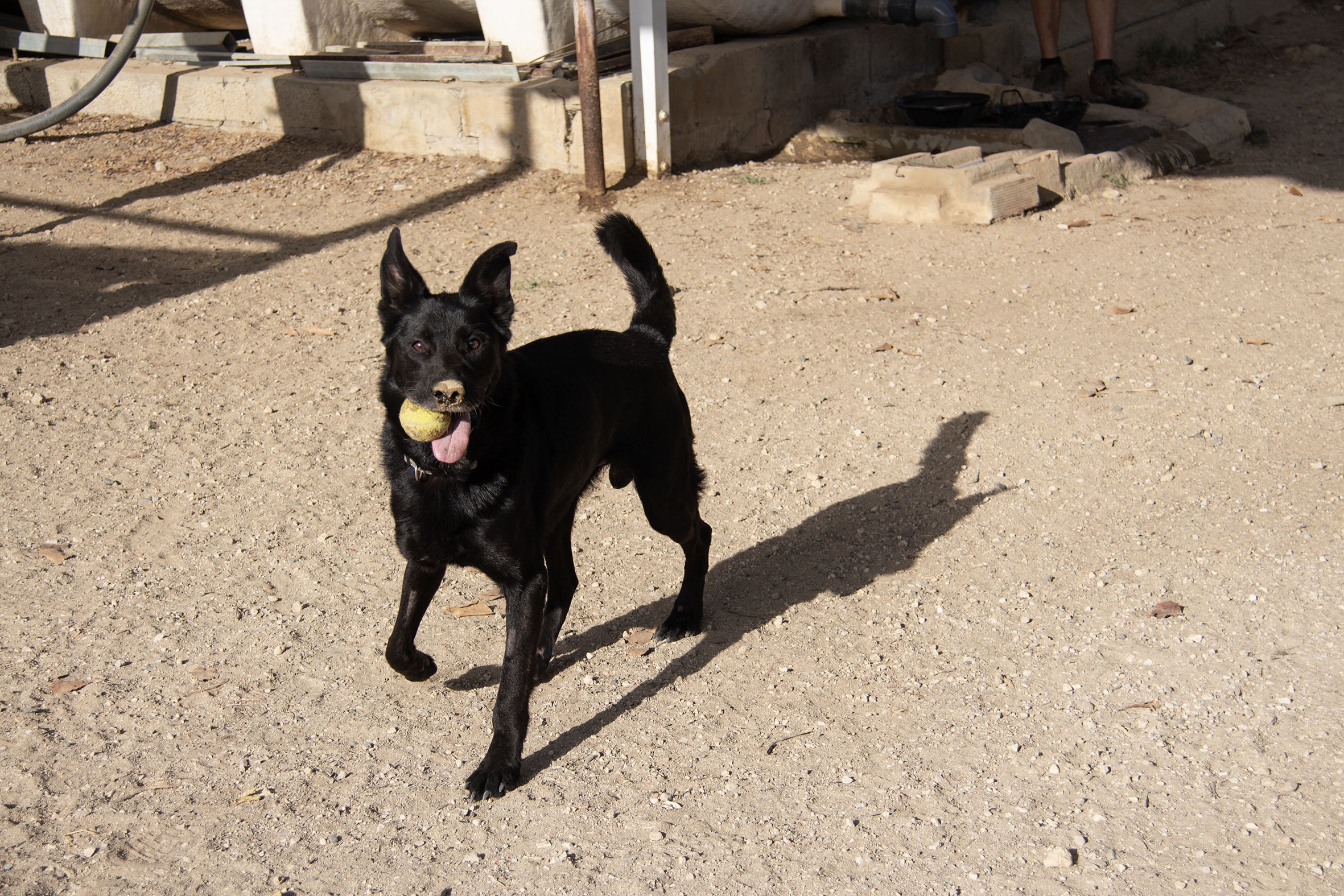 Mit den freiwilligen Helfern zeigt er sich sehr anhänglich und gehorsam, er mag ihre Aufmerksamkeit und das Spielen mit dem Ball.