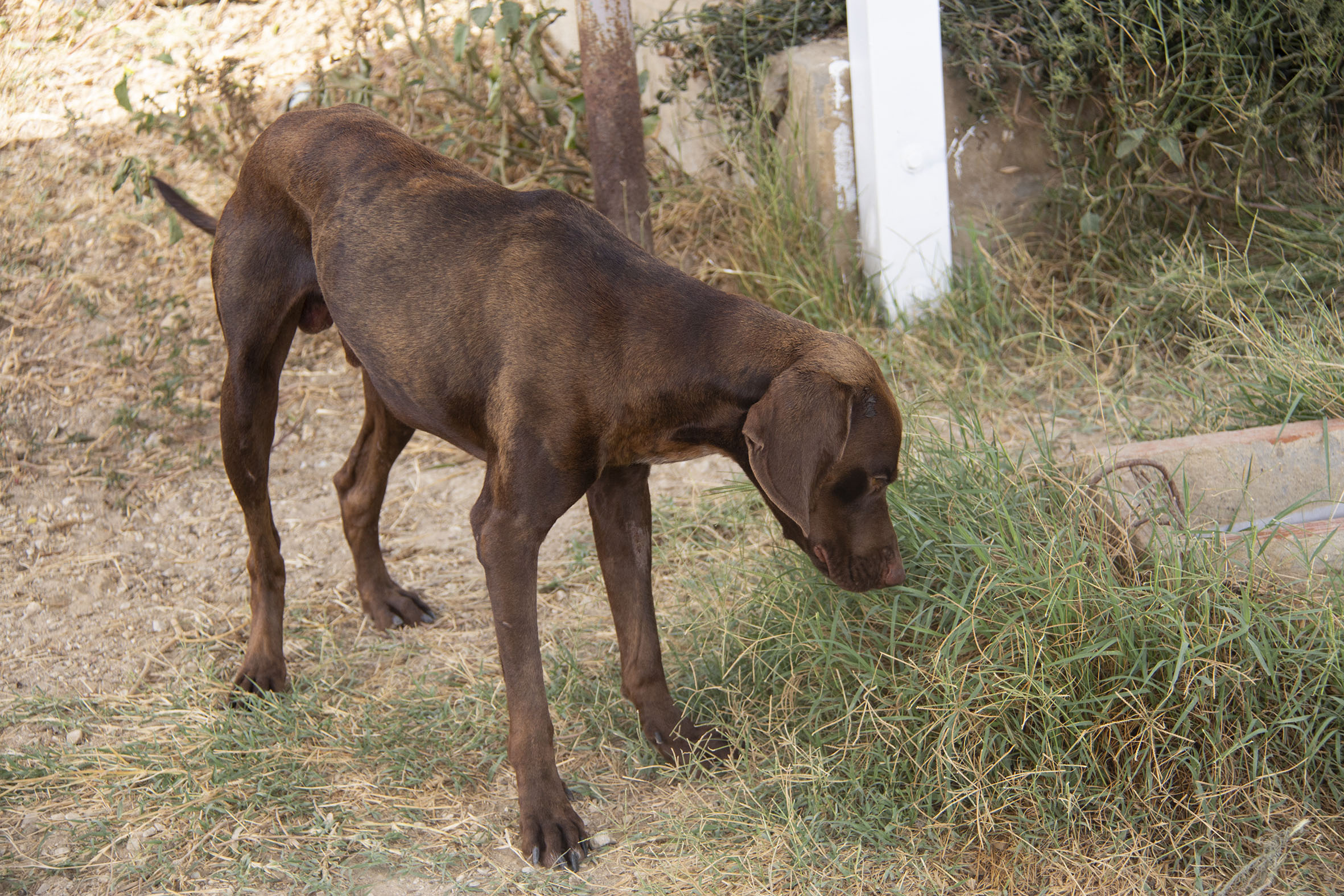 Flint wurde zusammen mit Frisco von der Polizei aus ganz schlechter Haltung geholt und die beiden haben Zuflucht im Melampo erhalten. Beide Hunde wurden vom alten Besitzer die ganze Zeit an einer Kette gehalten.