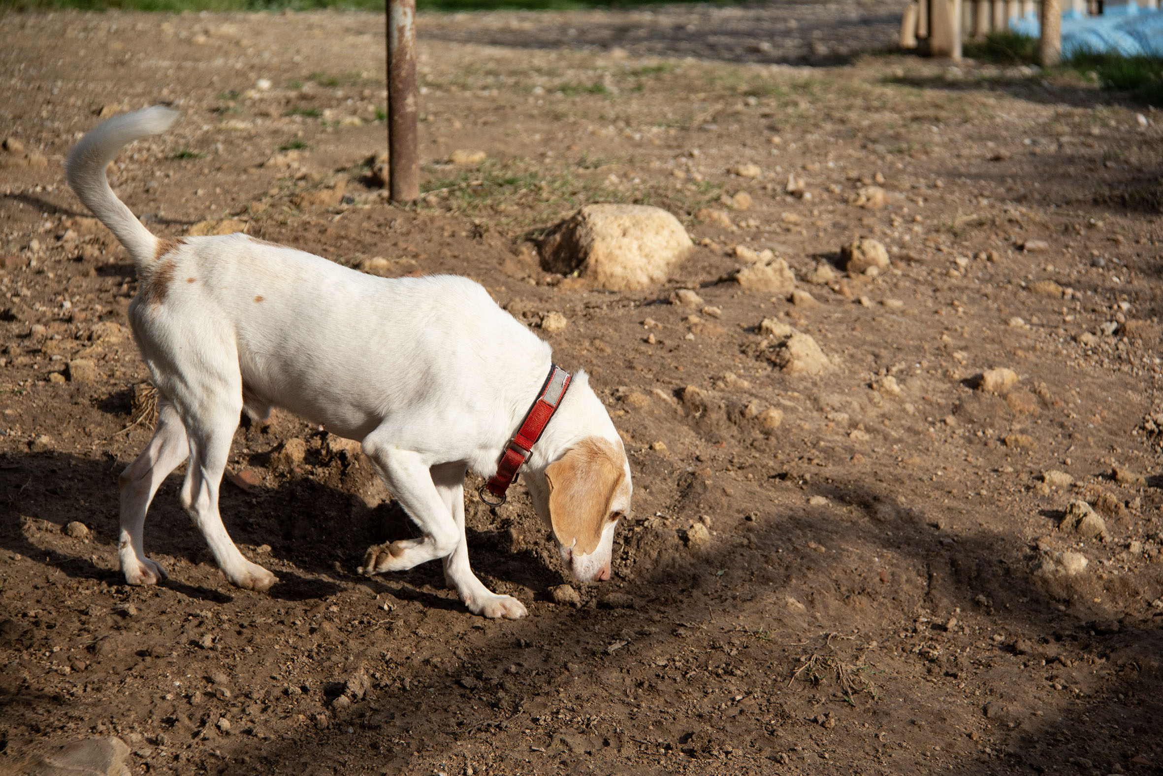Herausfordernd gestaltet sich aktuell noch das Verhalten im Freien. Draussen fühlt sich Haro unsicher und sucht oft Schutz in Büschen oder im Feld. Spaziergänge sind noch schwierig, da er sich nicht wirklich entspannen kann. Es gibt bereits gute Ansätze, die darauf hindeuten, dass er mit der Zeit selbstsicherer werden wird, doch es wird noch einiges an Geduld und Zeit erfordern, bis er sich im Freien wohler fühlt und man längere Spaziergänge mit ihm machen kann.