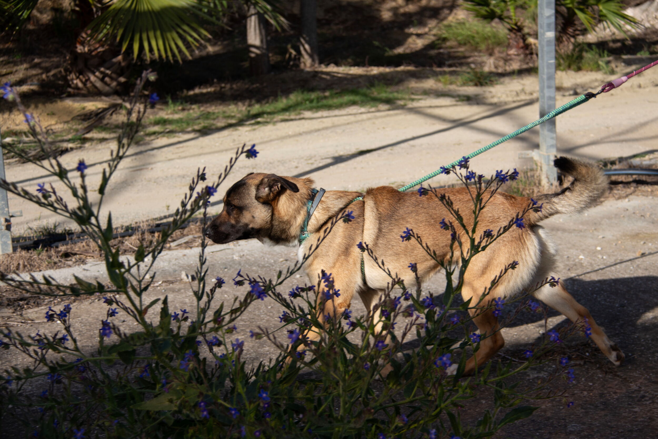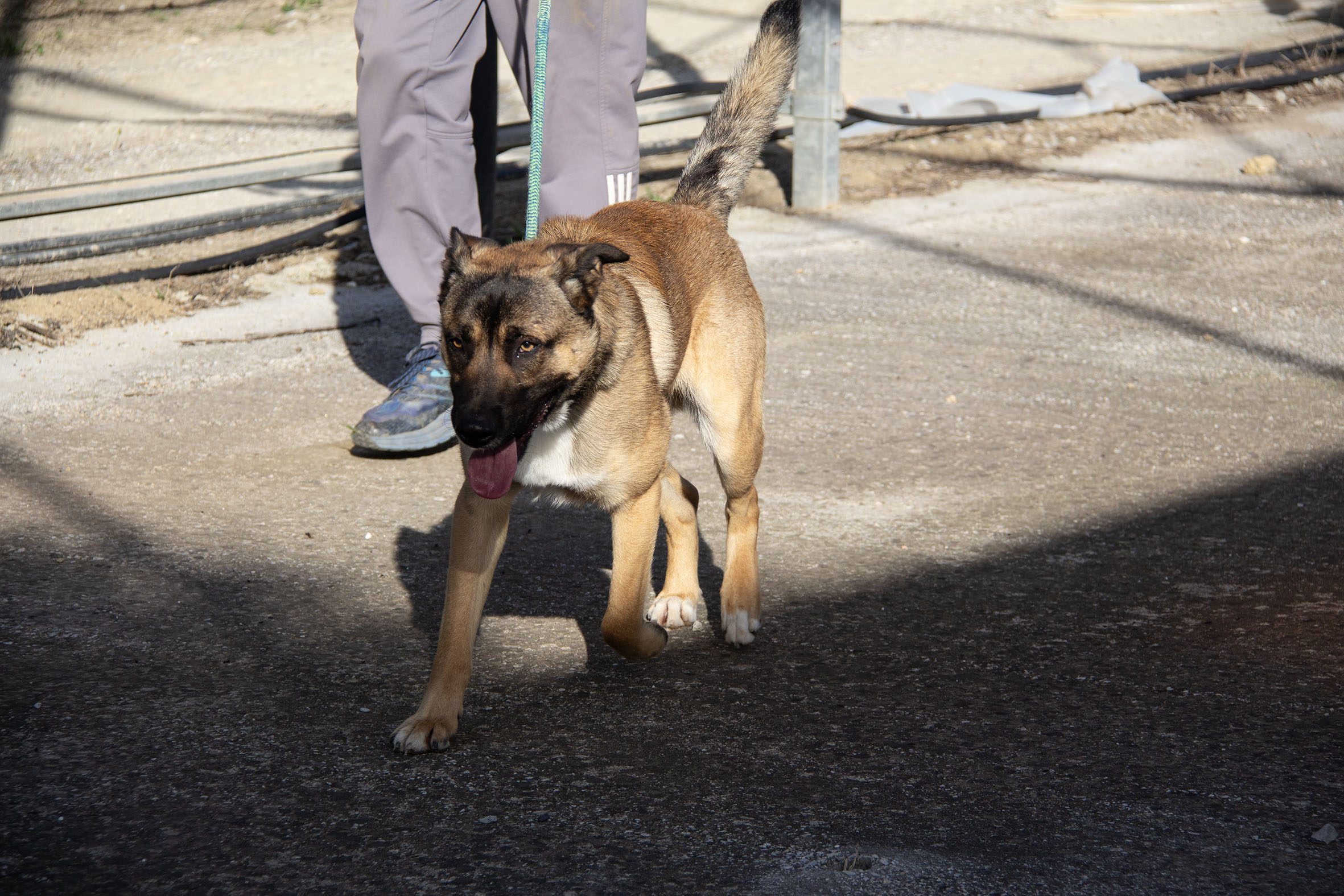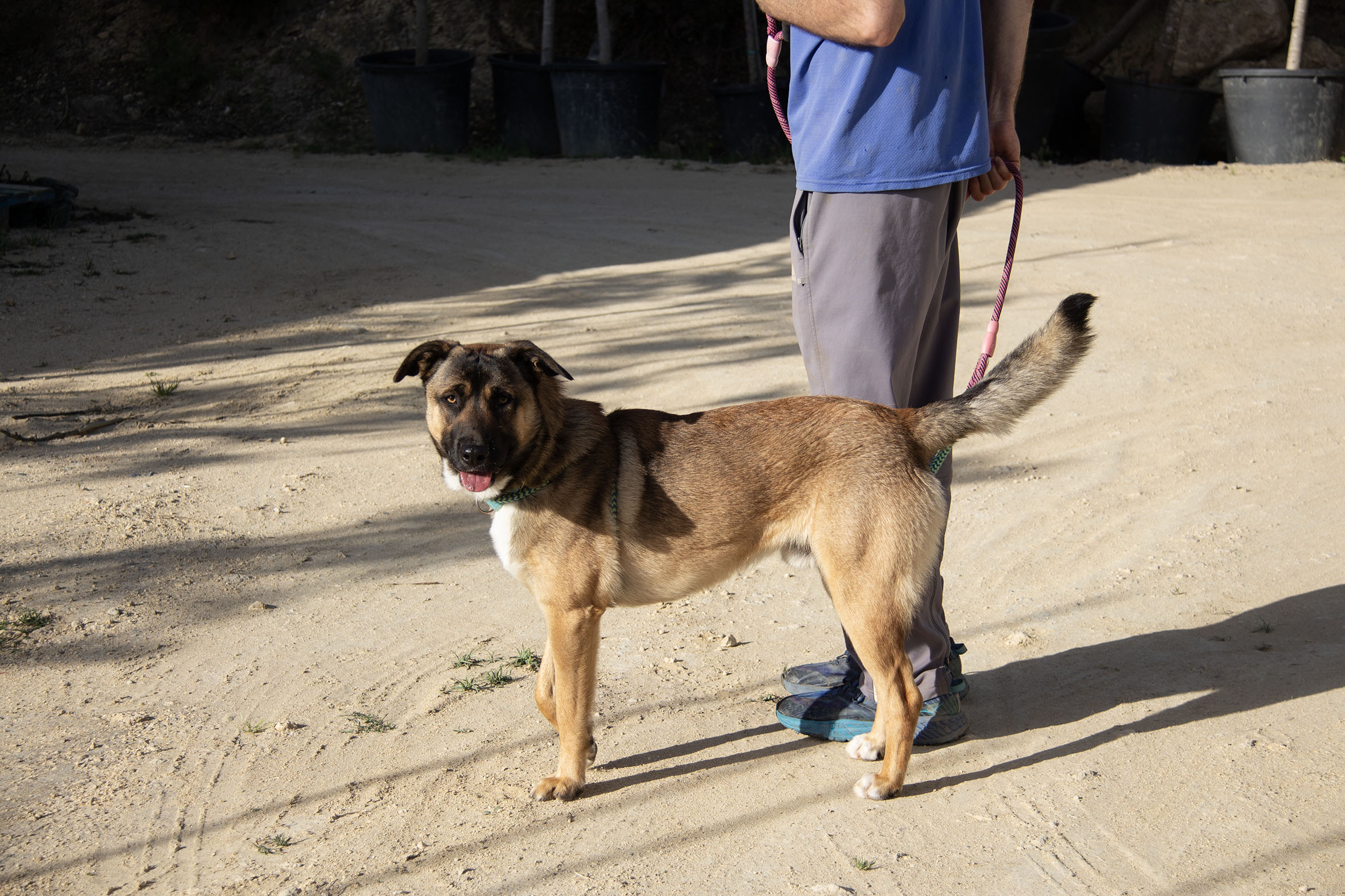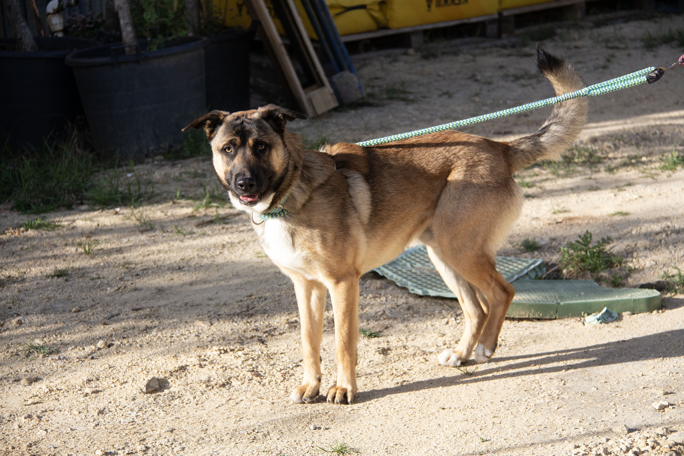 Zurück im Melampo-Camp zeigt sich Kamiel bisher gut im Verhalten – auch im Umgang mit seinen Artgenossen. Wir haben festgestellt, dass er ein toller Hund ist: aktiv, energiegeladen, verspielt – und er liebt es, im Wasser zu planschen. Er spielt und interagiert gerne mit anderen Hunden. Auch Spielzeug mag er sehr. Kommt jedoch zu viel Spannung, Rivalität oder Aufregung ins Spiel, kann es vorkommen, dass er wütend reagiert – auch wenn das nicht die Regel ist. Im Alltag rennt und spielt er täglich mit anderen Hunden und Spielzeug – in der Regel völlig unproblematisch. Nur in einzelnen Momenten kann es nötig sein, ihn zu korrigieren.