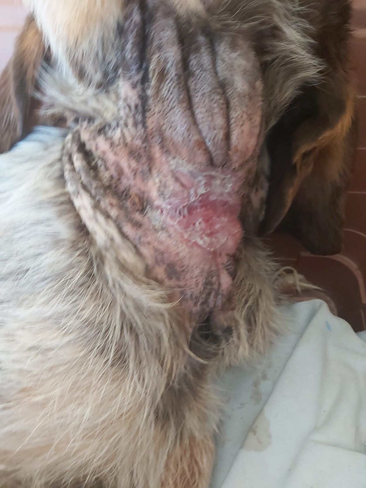 Marques wurde in der Nähe eines Dorfes versteckt, unter einem Verschlag aus Holzbrettern und Schilfrohr, neben einem Landhaus aufgefunden. Wir wissen nicht, wie er dort hin gekommen ist. Er hatte sich selbst schon völlig aufgegeben. Marques war sehr dünn, müde, hatte Angst und musste sehr starke Schmerzen aushalten. Sein "Halsband" war nämlich so fest um seinen Hals gebunden, dass es in die Haut eingewachsen war, was eine grosse, stark infizierte Wunde mit viel Eiter und einem fauligen Geruch hinterlassen hatte. Auf den Fotos sieht es so aus, als wäre die Haut am Hals zurückgezogen.