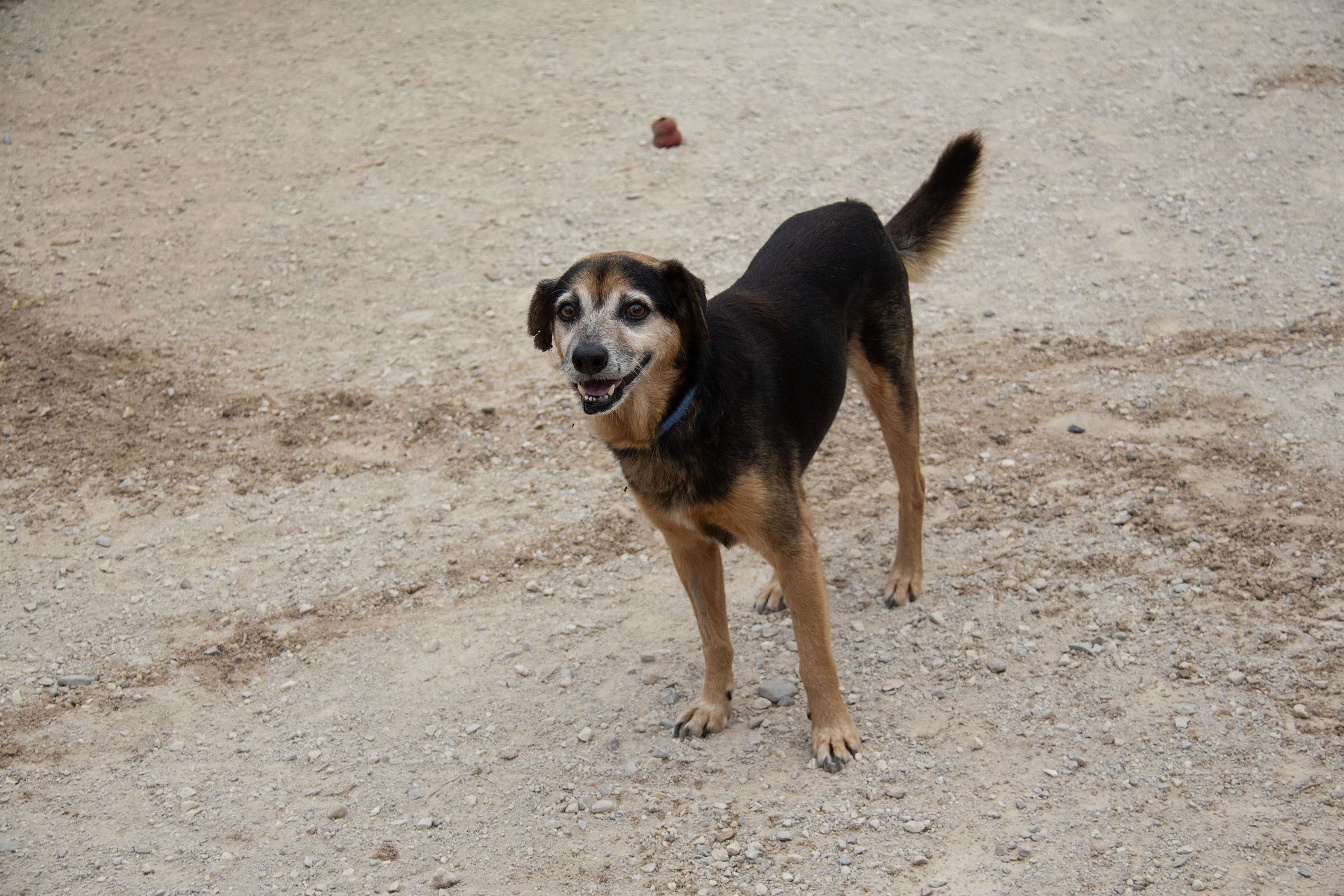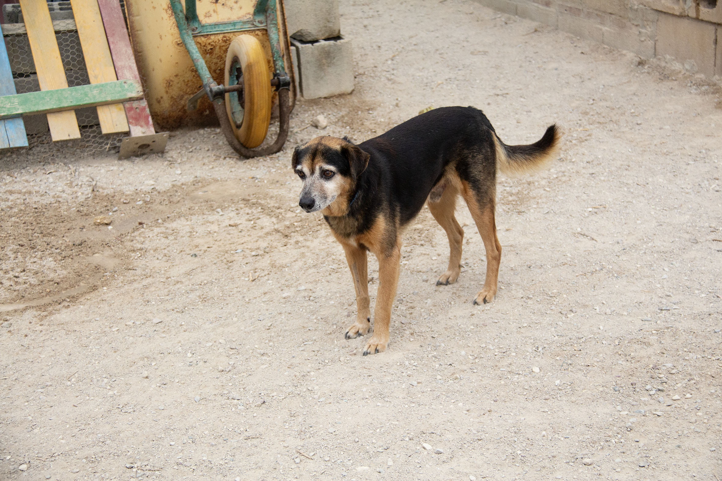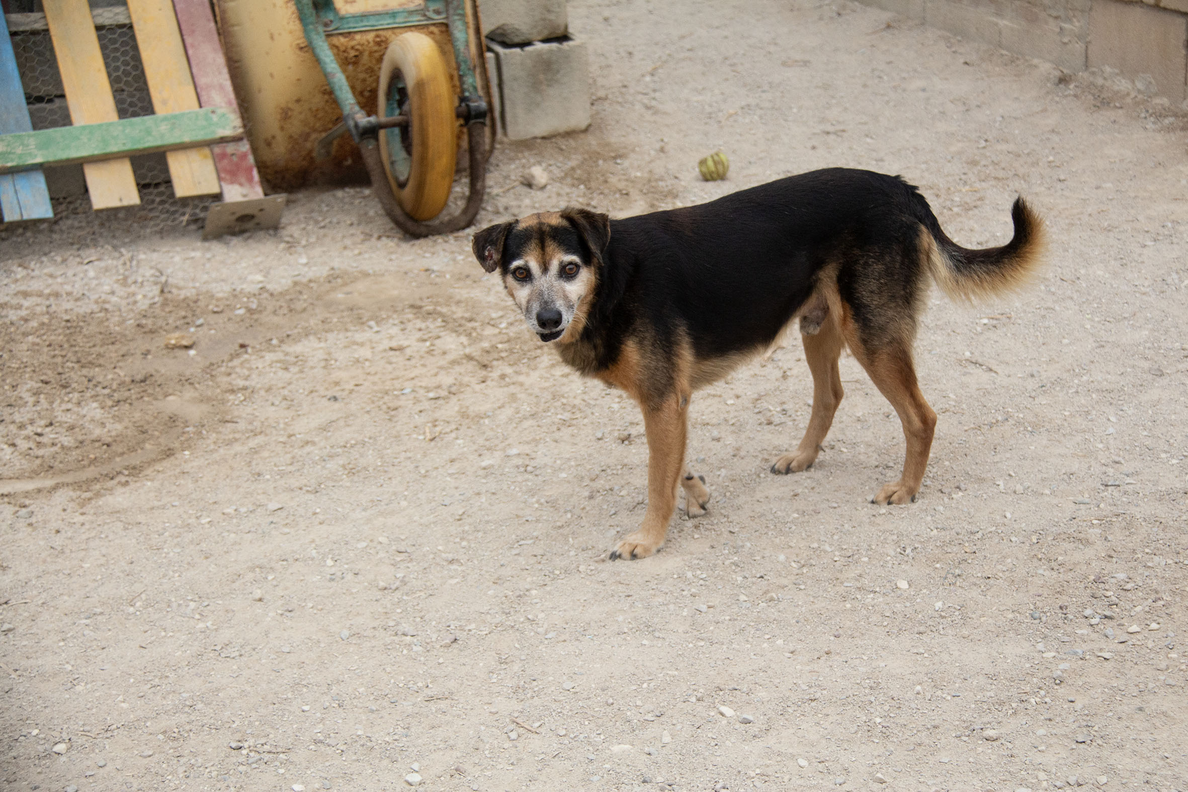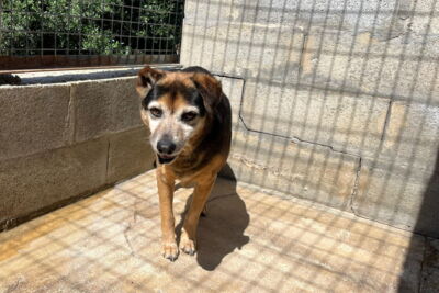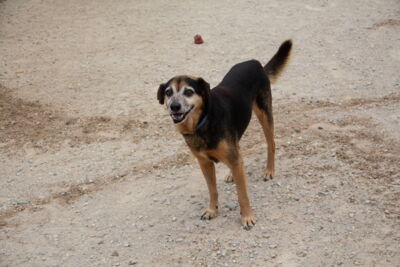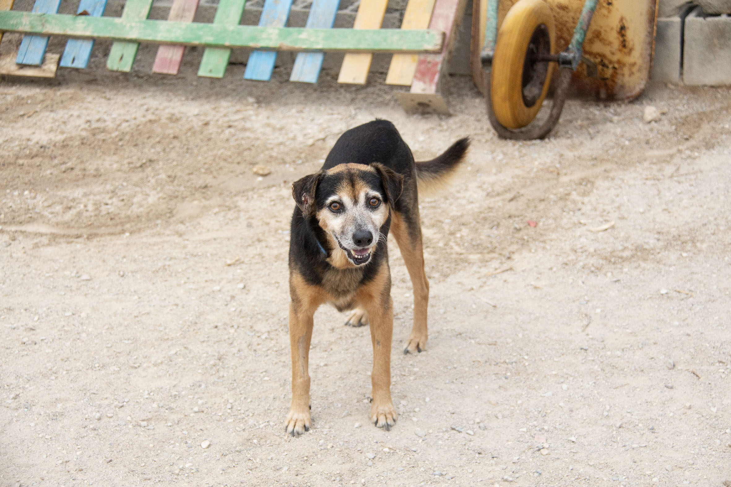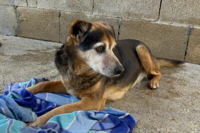 Poppet lebte zusammen mit anderen Hunden vor einem Supermarkt. Die Nachbarn haben die Hunde gefüttert. Die anderen Hunde wurden bereits gerettet, bis auch Poppet gerettet werden konnten und ins Melampo gebracht wurde.