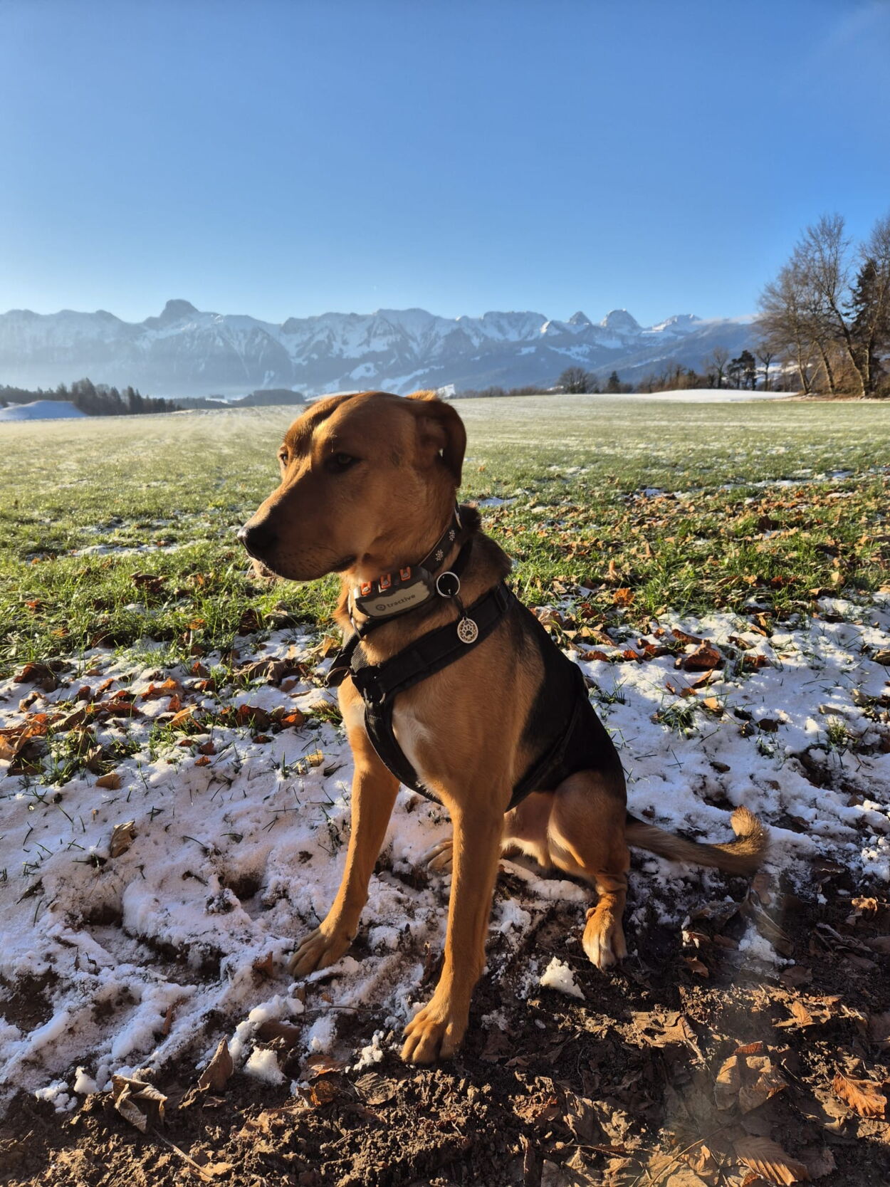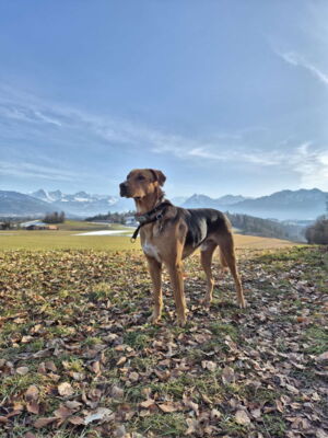 Tambo ist nun einen Monat bei uns. Er ist ein sehr lieber, aber sehr zurückhaltender und ruhiger Hund, der nach wie vor – vor allem draussen – mit seinen Ängsten zu kämpfen hat. Mit einer ruhigen, liebevollen Führung lässt er sich jedoch durch praktisch alle Situationen leiten. Im Haushalt sind Geräusche und Alltagshandlungen wie Staubsaugen, etc. kein Problem (Ausnahme Fernseher – da arbeiten wir dran). Es sind vor allem andere Menschen, die Tambo draussen ängstigen. Traktoren, Lastwagen, Autos und Pferde kreuzen sind unproblematisch. Hingegen fürchtet er sich je nach Situation vor fremden Menschen, insbesondere wenn er diese nur hört und nicht sieht. Er lässt sich aber auch dann sehr gut händeln.