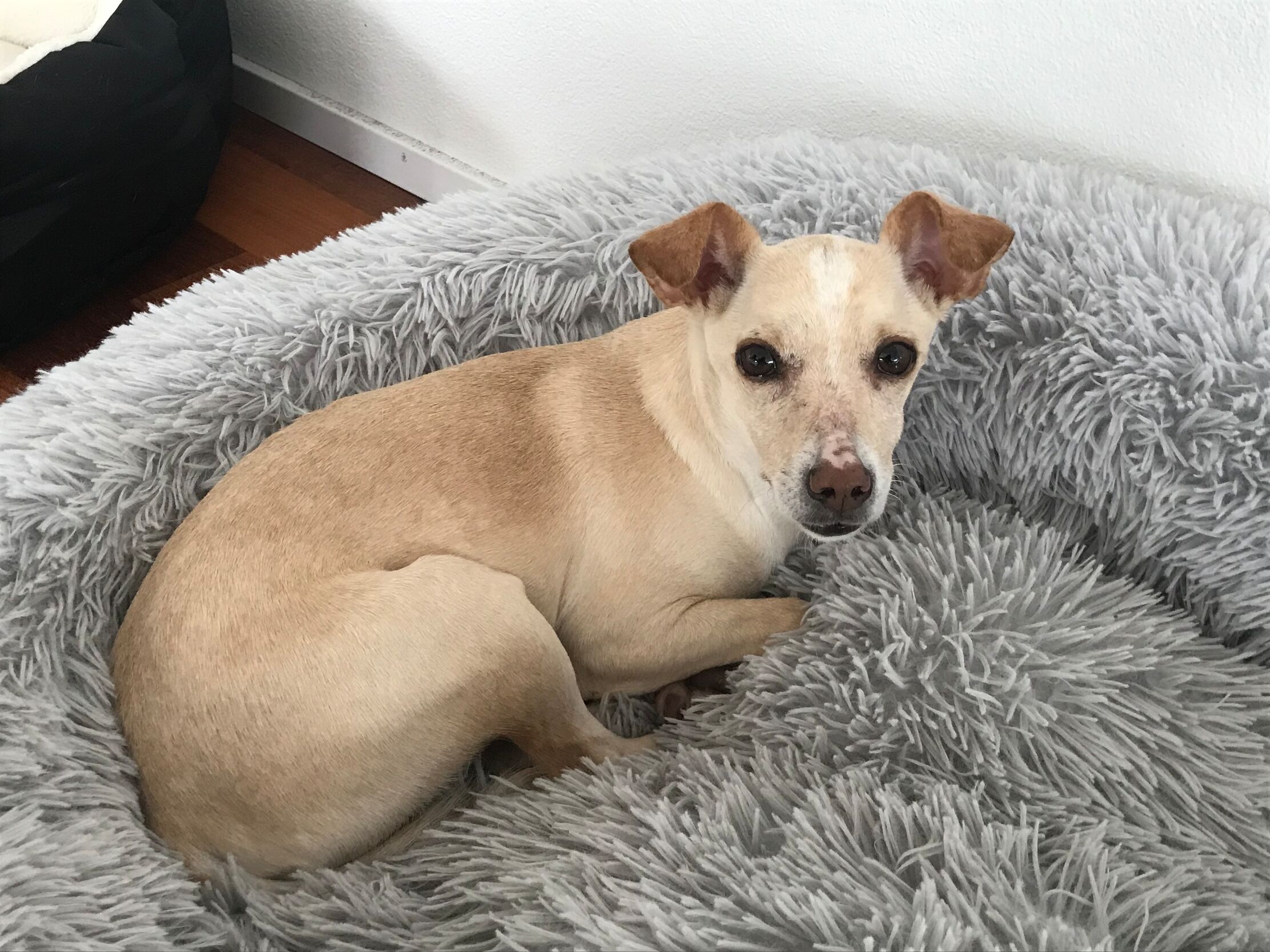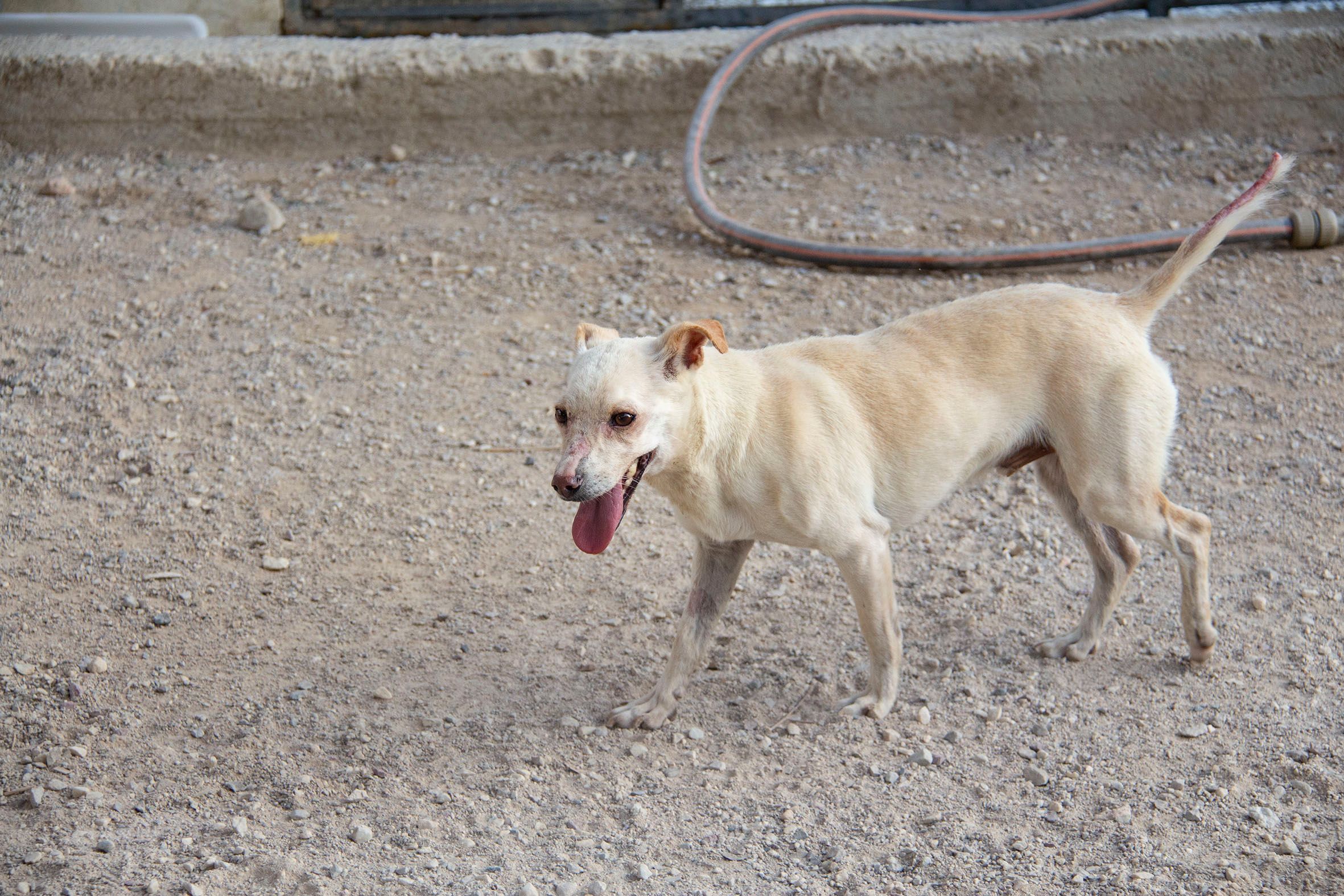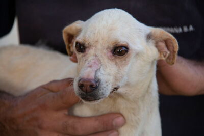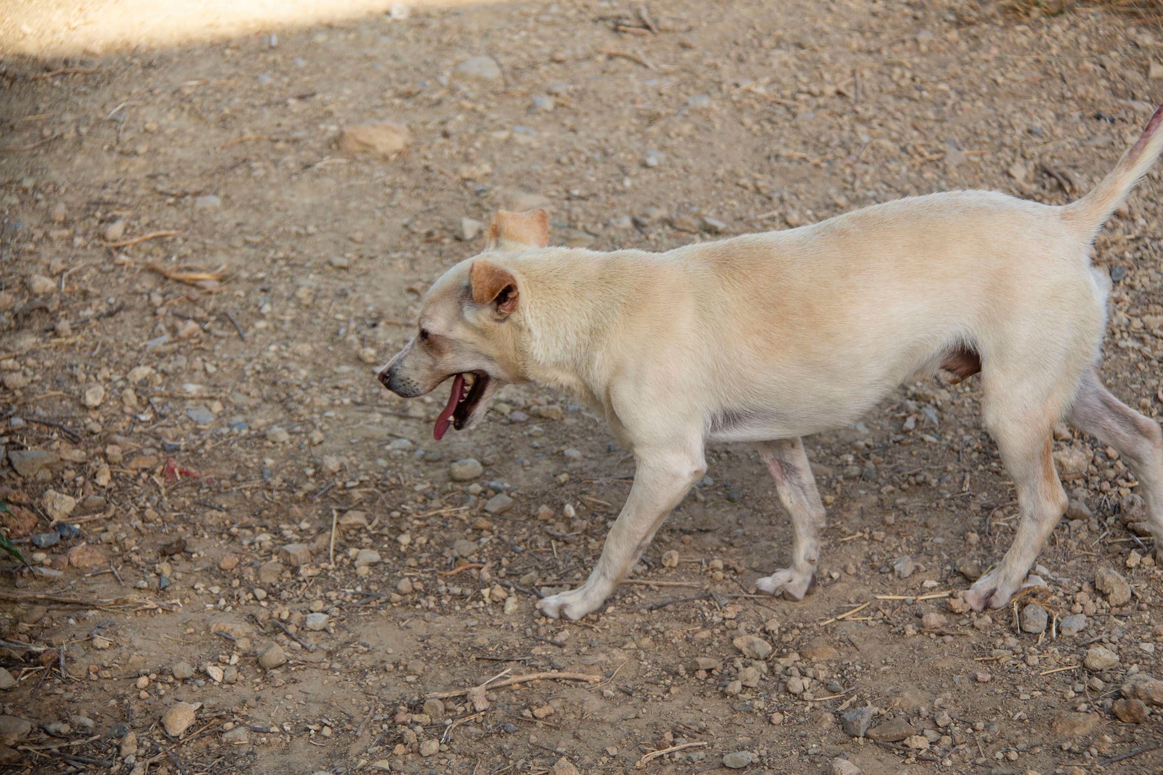 Der kleine Wilo wurde wohl ausgesetzt und in der Nähe von San Roque gefunden. Er konnte zum Glück in Melampo untergebracht werden. Leider war seine Haut in einem sehr schlechten Zustand. Vor allem im Gesicht und an seiner Rute waren kahle Stellen zu sehen und er litt unter starkem Juckreiz. Daraufhin wurde er vom Tierarzt untersucht und es wurden Blutproben genommen. Zum Glück konnte er negativ auf Mittelmeerkrankheiten getestet werden.